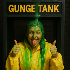 "A bit goofy but the gungings are good." This video contains 4 gungings and nice amount of in-gunge play. However, i'm not a fan of the wacky sound effects and laughter / applause. Maybe this was a one-off choice for this NHP inspired video, but in previous Totally Gunged videos, gungings are preceded by a seductive voice declaring things like "Splat... the... brat" or "Plunge... the... gunge", which I prefer to be honest. | |